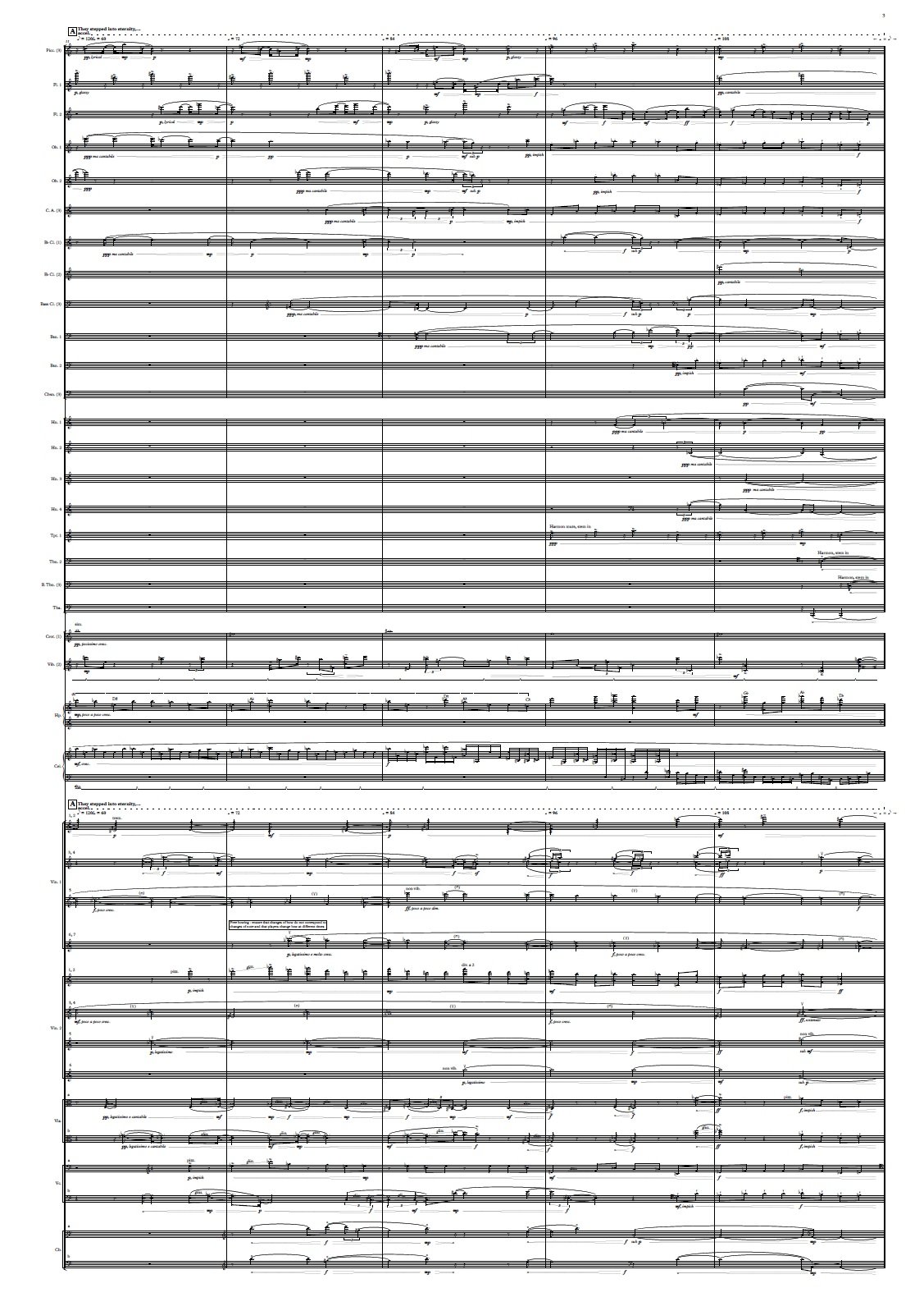 Aural illusions are used to sonically describe the fabric of this ghostly dimension. In the piece’s first section, scales seem to descend and rise eternally, rhythms accelerate constantly and melodies project echoes out from themselves. These illusions which allude to the infinite are used to depict the malicious, strange, swirling atmosphere into which Virginia and the ghost step into. As these swirling orchestral textures come to a climax, a lone melody in the viola and alto flute, which represents Virginia and her steadfast purity, ushers in the piece’s second section. Still, the evil spirits continue to plague Virginia: strings scurry around the alto flute and viola, brass and wind chords stab at them, and ghostly resonances from the harp, vibraphone, celesta and marimba jump out from nowhere. In the third section, materials from the first and second section are superimposed. Virginia’s melody fights against being swallowed up by the swirling, illusory texture of evil spirits. At the piece’s climax, midnight tolls, thunder strikes, ‘a strain of unearthly music float[s] through the air’, and Virginia returns from the void having granted the ghost peace and absolution. The small coda which ends the piece represents an imagining of this ‘unearthly music’: microtonal harmonies waft through the air, and a Gagaku influenced flute trio loosely evokes the Garden of Death, where ‘the nightingale sings all night long… and the cold crystal moon looks down, and the yew-tree spreads out its giant arms over the sleepers.’