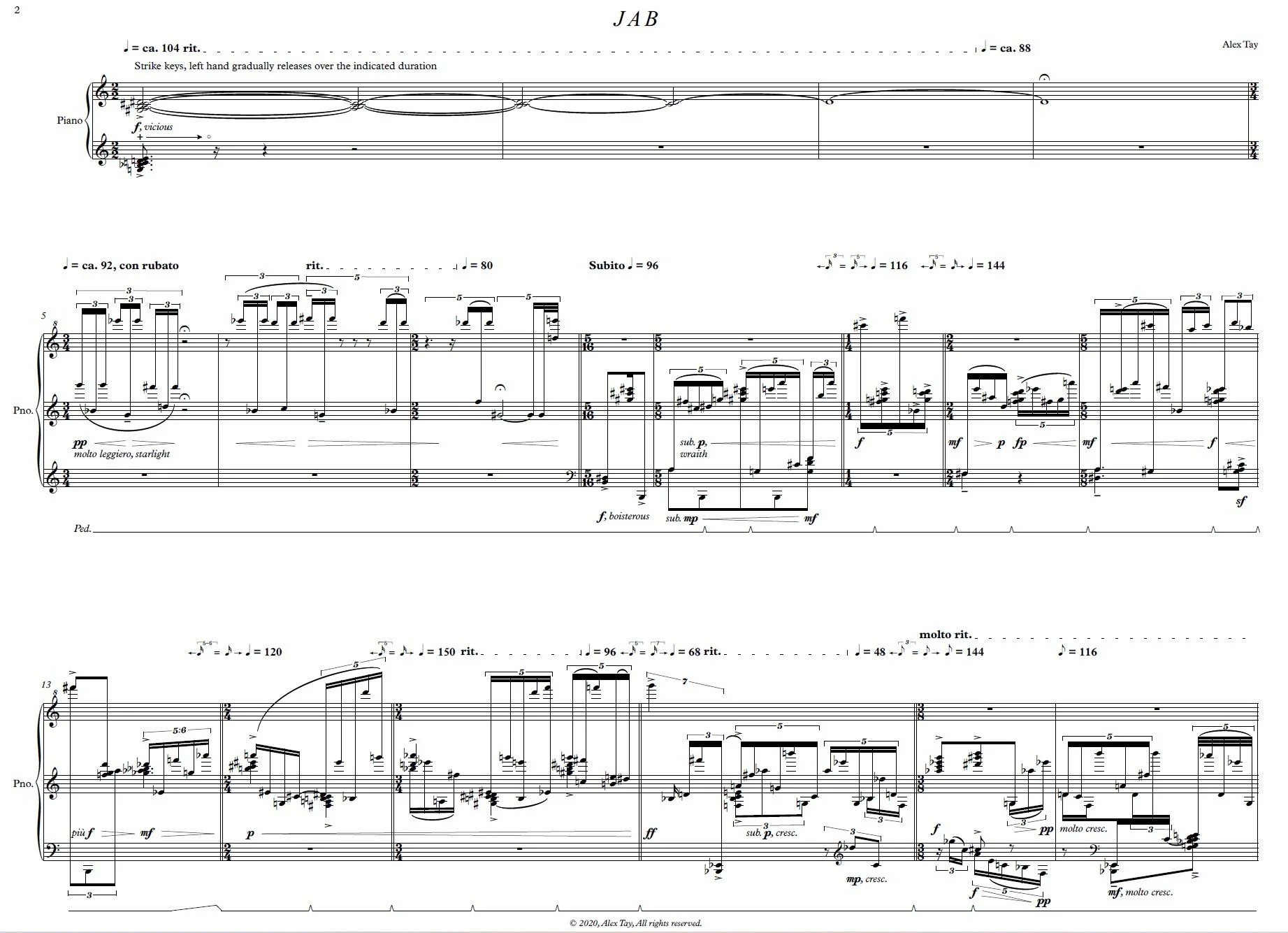 "‘Jab’ is a glittering display of virtuosity that is full of surprises at every turn. Tay has written a significant work for solo piano that expresses the state of overload that defines our modern life: there is overwhelming angst, of course, but it is also overflowing with beauty and poignancy." Dr Tonia Ko, Lecturer in Composition at Royal Holloway